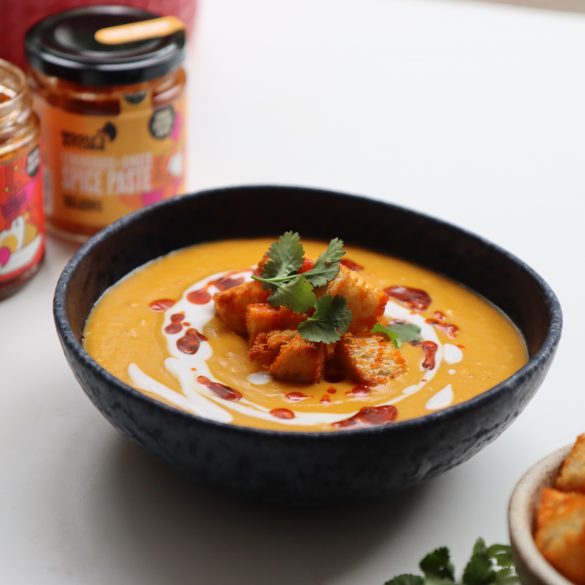 - Top with chilli oil croutons, a generous drizzle of Chilli Crunch, a squeeze of lime and coriander.